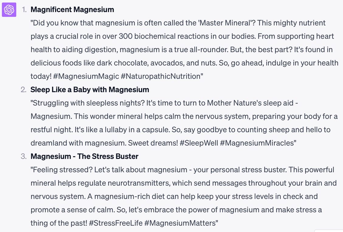 Prompt: “Write 3 catchy Instagram posts about magnesium, based on the perspective of a naturopath.”